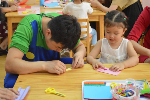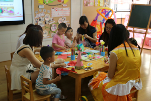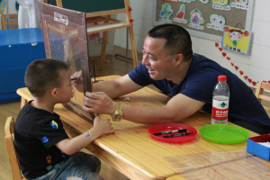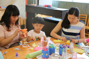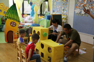 全园开放了43个室内外游戏区和2个自主休息区,供孩子们带着家人去“做客”。孩子们热情地向家人介绍自己熟悉的游戏区,领着家人到自己喜爱的游戏区玩耍,为家人讲解游戏规则和要领,亲子合作创制节日礼物。在开放共享的游戏环境中,大人、小孩自由结伴,共商活动内容,共用活动材料,共建学习经验,玩得不亦乐乎,全然没有年龄、长幼之分,把幼儿园变成了游戏的乐园、欢乐的海洋。
