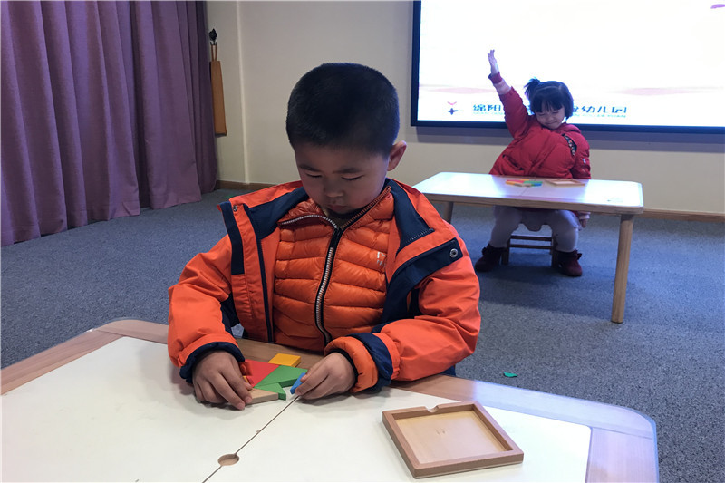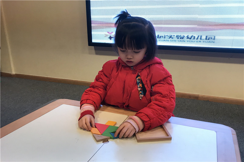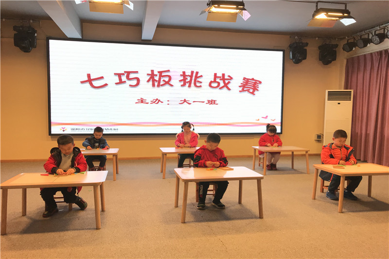 一声令下,小选手们即刻投入比赛状态,一个个小脑袋不时地来回移动着,一双双小眼睛不停地左右转动着,紧张而兴奋,快速而有序。一块块五颜六色的七巧板穿梭于小朋友小巧的手指间,不一会儿功夫,就拼出了他们记忆中的图案。